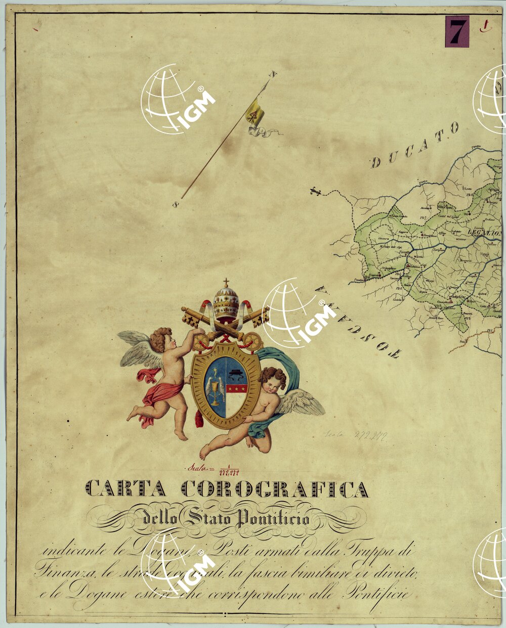CARTA COROGRAFICA DELLO STATO PONTIFICIO INDICANTE LE DOGANE I POSTI ARMATI DALLA TRUPPA DI FINANZA, LE STRADE DOGANALI, LA FASCIA BIMILIARE DI DIVIETO E LE DOGANE ESTERE CHE CORRISPONDONO ALLE PONTIFICIE.