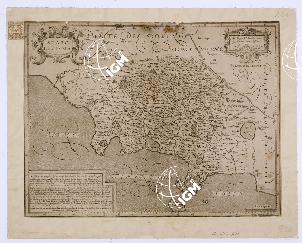 Dedicata a Pandolfo Savini, gentiluomo senese, con firma di Arnoldo di Arnoldi. Incisione su rame su foglio unico. È derivazione della carta del Buonsignori (1584). In basso a sinistra una leggenda con notizie storiche di Siena. Orografia a monticelli. Abitati rappresentati schematicamente in prospettiva. Limiti: nord, Fiorenza; sud, Isola del Giglio; est, Perugia; ovest, Pisa.