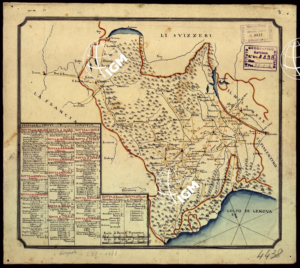 Carta simile alla precedente con indicazione però nella parte inferiore delle varie stazioni di Posta in scala di miglia piemontesi.