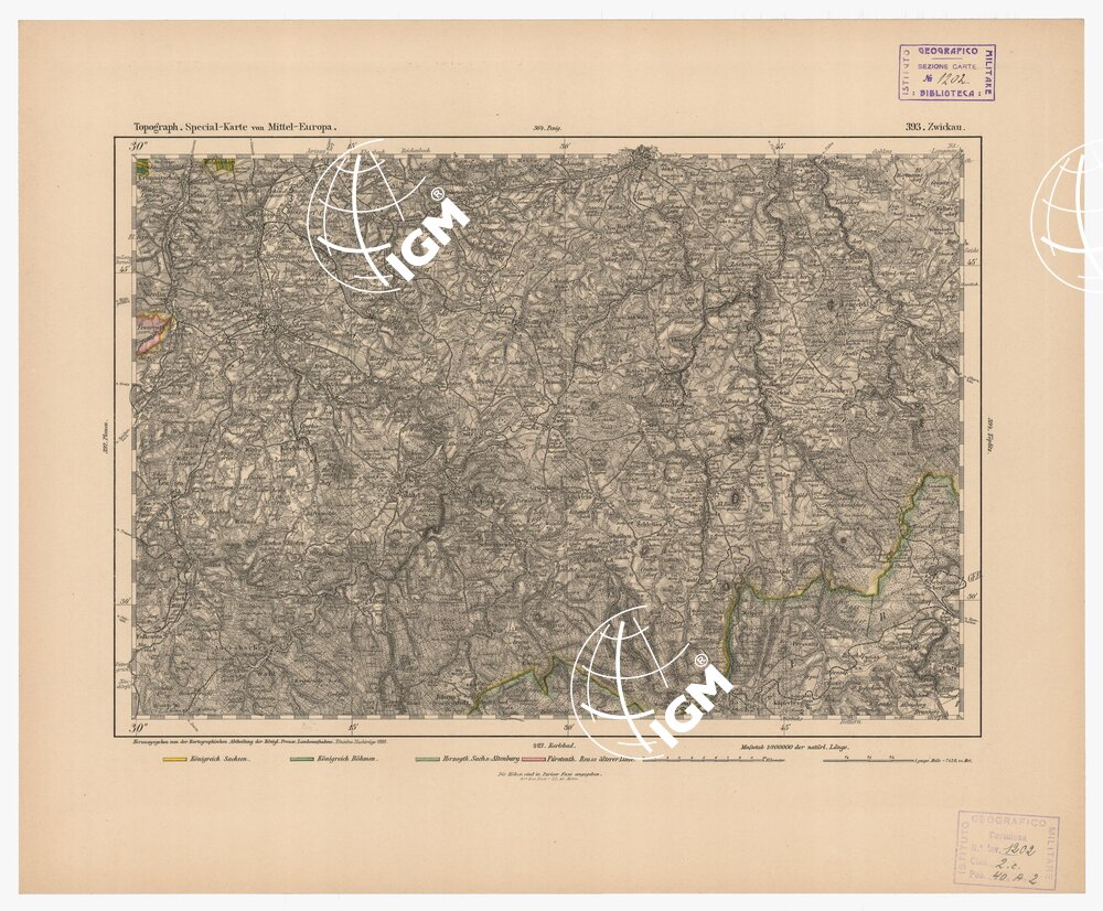 Autore Reymann, luogo di edizione Berlino. Rappresentazione orografica a tratteggio. Tipo in nero colorato a mano.