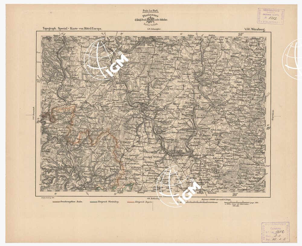 Autore Reymann, luogo di edizione Berlino. Rappresentazione orografica a tratteggio. Tipo in nero colorato a mano.