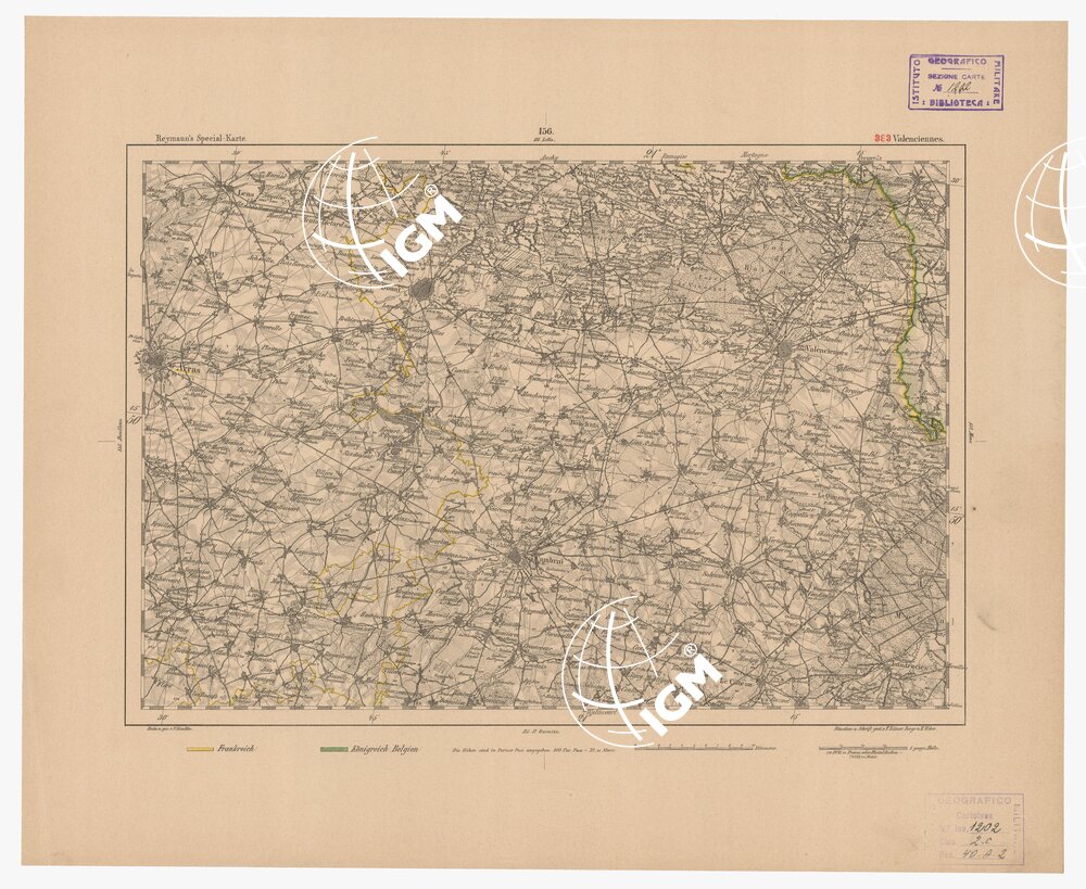 Autore Reymann, luogo di edizione Berlino. Rappresentazione orografica a tratteggio. Tipo in nero colorato a mano.