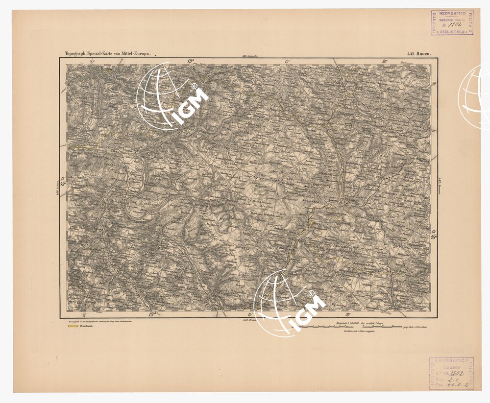 Autore Reymann, luogo di edizione Berlino. Rappresentazione orografica a tratteggio. Tipo in nero colorato a mano.