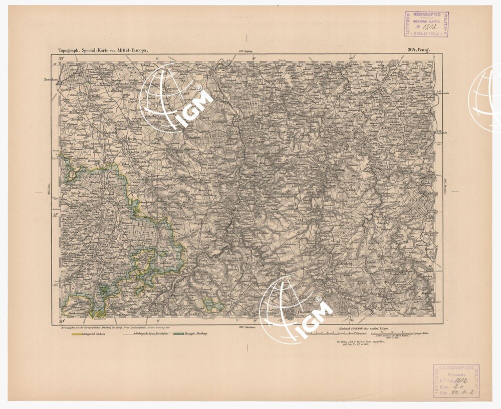 Autore Reymann, luogo di edizione Berlino. Rappresentazione orografica a tratteggio. Tipo in nero colorato a mano.