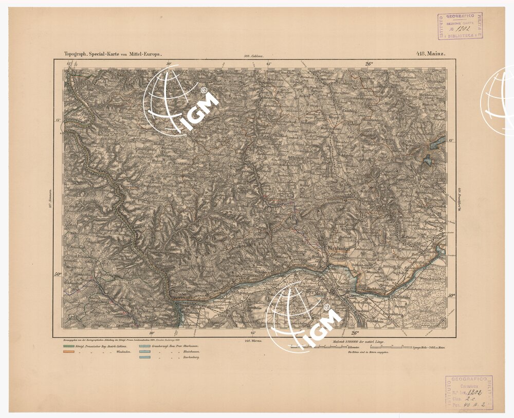 Autore Reymann, luogo di edizione Berlino. Rappresentazione orografica a tratteggio. Tipo in nero colorato a mano.