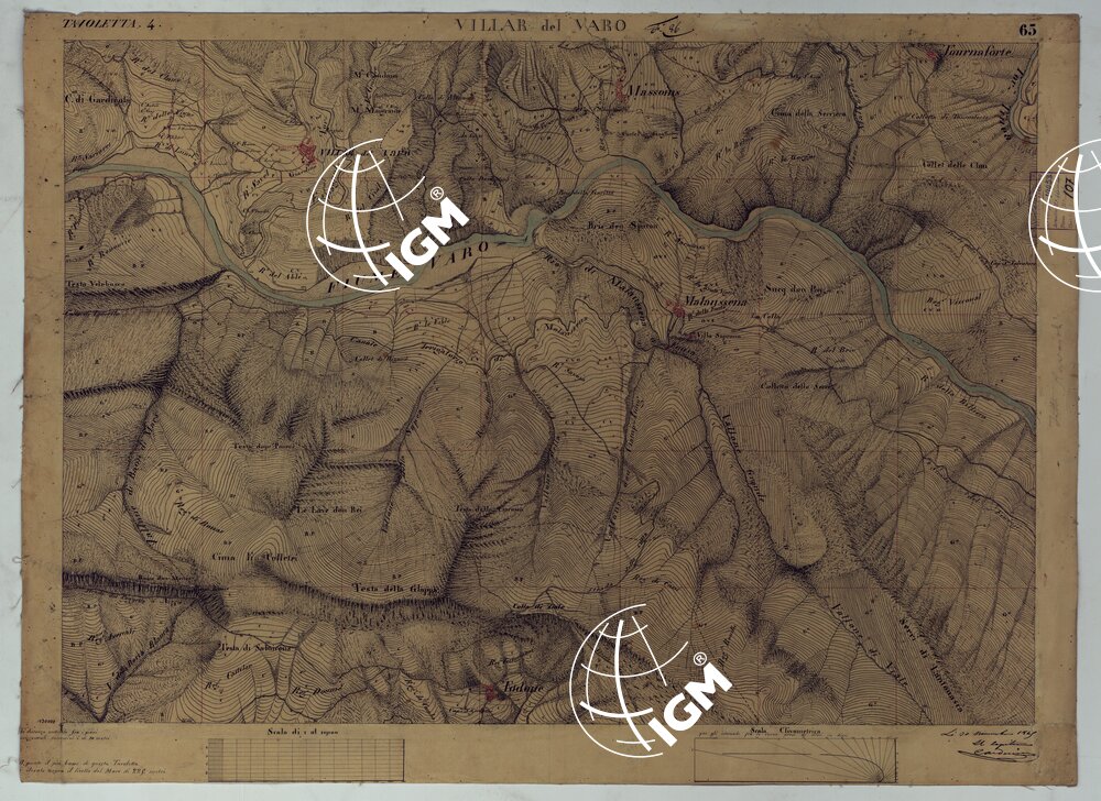 Rilievo regolare in 99 tavolette (minute di campagna) del territorio della Contea di Nizza. Il rilievo è dimostrato a curve orizzontali, tracciate all’equidistanza di 10 metri. Gli operatori furono ufficiali di armi diverse, probabilmente allievi della Scuola di S. M. : Avet, Albert, Borson, Basso, Bergalli, Costanze, Cordon, Ceva, Colli, Carderina, Cordero, Coda, Di Pralormo, Dal Pozzo, De Fornari, De Candia, D’Angennes, Escoffier, Federici, Falicon, Govone, La Grange, La Fleche, Muletti, Marazzano, Mazè, Morozzo, Mariani, Pictet, Ponzani, Piola Caselle, Righini, Rinaudo, Ricci, S. Andrea, Somis, Villamarina.