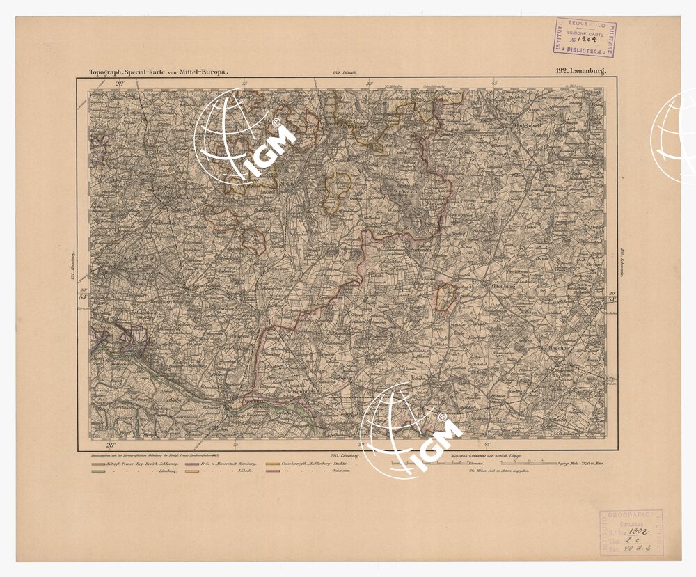 Autore Reymann, luogo di edizione Berlino. Rappresentazione orografica a tratteggio. Tipo in nero colorato a mano.