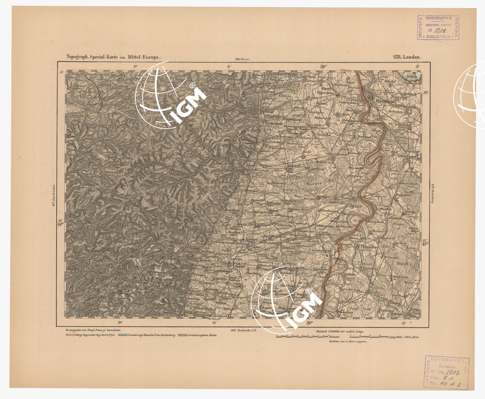Autore Reymann, luogo di edizione Berlino. Rappresentazione orografica a tratteggio. Tipo in nero colorato a mano.