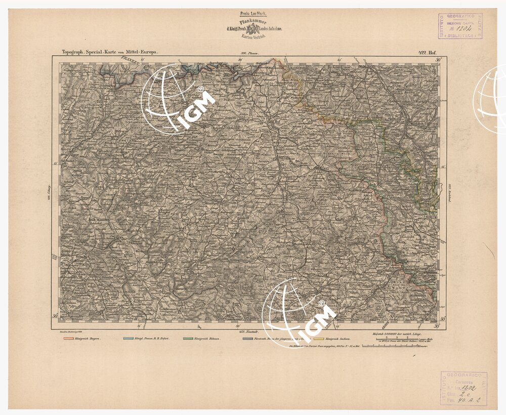 Autore Reymann, luogo di edizione Berlino. Rappresentazione orografica a tratteggio. Tipo in nero colorato a mano.