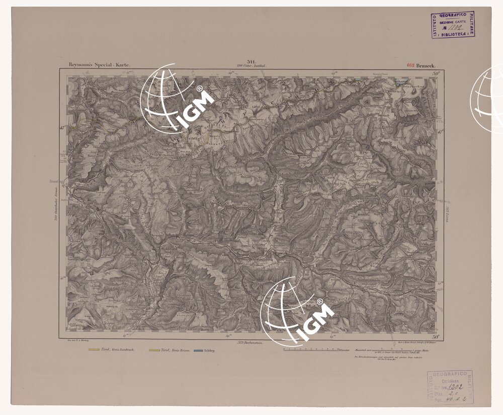 Autore Reymann, luogo di edizione Berlino. Rappresentazione orografica a tratteggio. Tipo in nero colorato a mano.
