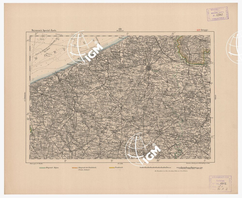 Autore Reymann, luogo di edizione Berlino. Rappresentazione orografica a tratteggio. Tipo in nero colorato a mano.