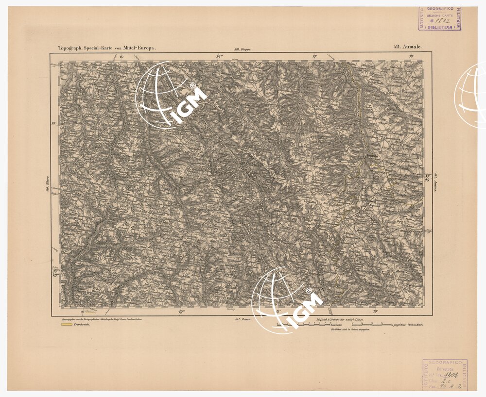 Autore Reymann, luogo di edizione Berlino. Rappresentazione orografica a tratteggio. Tipo in nero colorato a mano.
