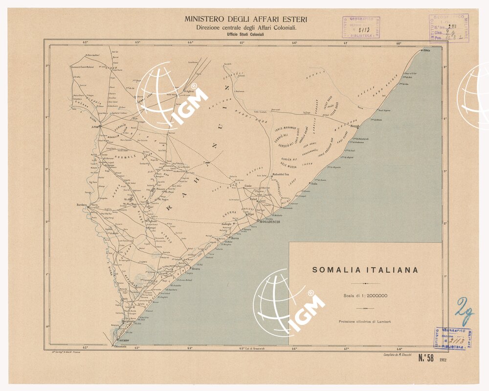 Carta generale compilata da M. Checchi costruita su proiezione cilindrica di Lambert. È rappresentata la sola planimetria. Stampa in due colori, azzurro per le acque, nero per il rimanente. Comprende la zona limitata da 0° 20′ lat. sud e 5° 20′ lat. nord e da 41° 20′ e 48° 40′ long. est da Greenwich.
