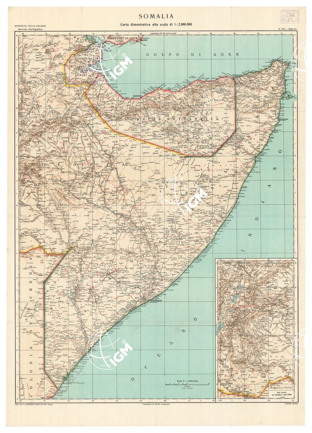 Ministero delle Colonie – Servizio Cartografico. Redattore e disegnatore A. Dardano (Direttore del Servizio Cartografico). Tipolitografia del Servizio Cartografico.