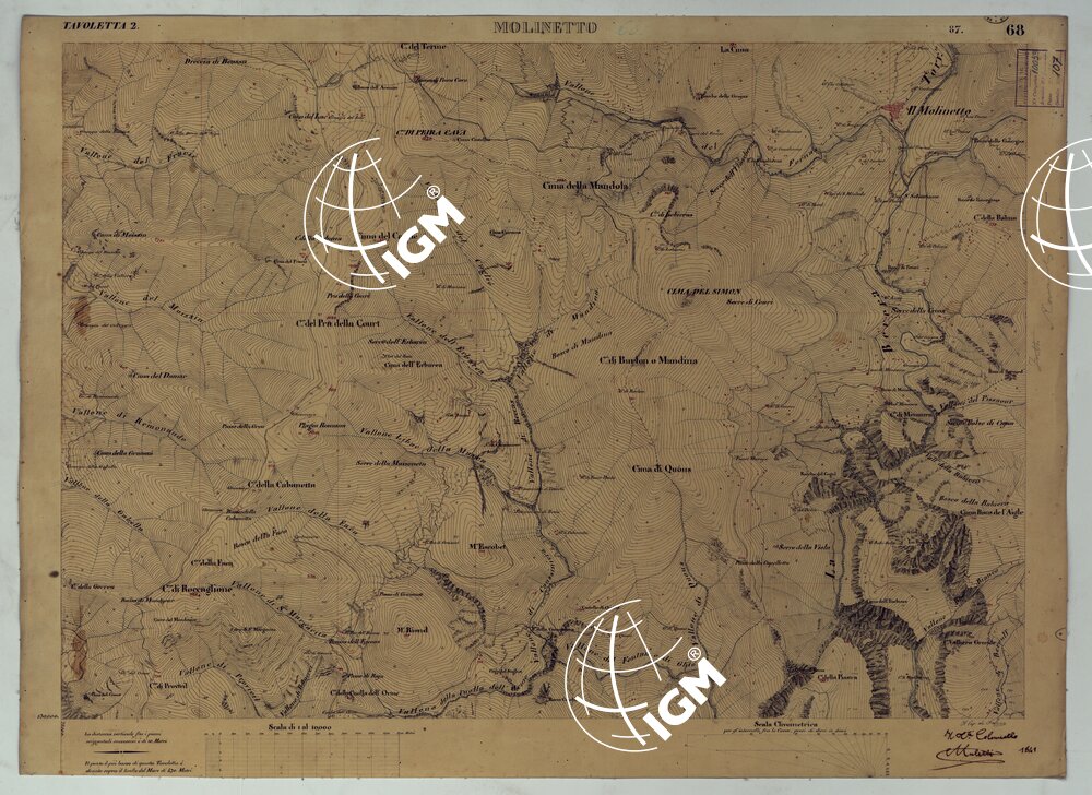 Rilievo regolare in 99 tavolette (minute di campagna) del territorio della Contea di Nizza. Il rilievo è dimostrato a curve orizzontali, tracciate all’equidistanza di 10 metri. Gli operatori furono ufficiali di armi diverse, probabilmente allievi della Scuola di S. M. : Avet, Albert, Borson, Basso, Bergalli, Costanze, Cordon, Ceva, Colli, Carderina, Cordero, Coda, Di Pralormo, Dal Pozzo, De Fornari, De Candia, D’Angennes, Escoffier, Federici, Falicon, Govone, La Grange, La Fleche, Muletti, Marazzano, Mazè, Morozzo, Mariani, Pictet, Ponzani, Piola Caselle, Righini, Rinaudo, Ricci, S. Andrea, Somis, Villamarina.