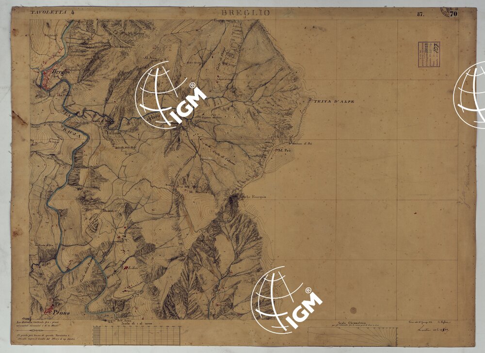 Rilievo regolare in 99 tavolette (minute di campagna) del territorio della Contea di Nizza. Il rilievo è dimostrato a curve orizzontali, tracciate all’equidistanza di 10 metri. Gli operatori furono ufficiali di armi diverse, probabilmente allievi della Scuola di S. M. : Avet, Albert, Borson, Basso, Bergalli, Costanze, Cordon, Ceva, Colli, Carderina, Cordero, Coda, Di Pralormo, Dal Pozzo, De Fornari, De Candia, D’Angennes, Escoffier, Federici, Falicon, Govone, La Grange, La Fleche, Muletti, Marazzano, Mazè, Morozzo, Mariani, Pictet, Ponzani, Piola Caselle, Righini, Rinaudo, Ricci, S. Andrea, Somis, Villamarina.