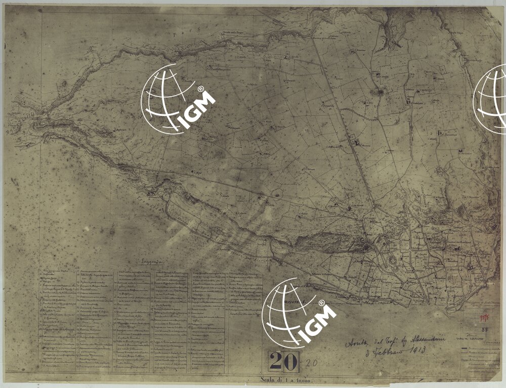 Docum. 20. Due fogli firmati rispettivamente dall’Ing. G. Bosco e L. Cavalieri, disegnati a colori rosso per le costruzioni, azzurro per le acque, con orografia dimostrata mediante curve di livello tracciate all’equidistanza di m. 10 e tratteggio (rocce). Il foglio settentrionale è corredato di elenco numerico delle principali costruzioni. Annessi tre lucidi e una riproduzione fotografica del foglio settentrionale eseguito dall’I.G.M. nel 1913.