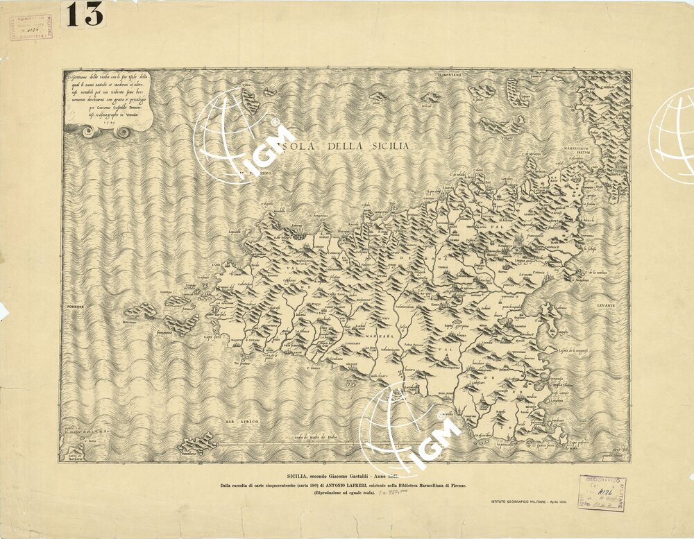“Descrizione della Sicilia con le sue isole della qual li nomi antichi et moderni et altre cose rotabili per un libretto sono brevemente decchiarati, con gratia et privilegio per Giacomo Gastaldo piemontese, cosmographo in Venetia”. 1545.