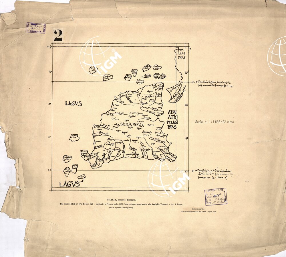 Dal Codice Edili n. 175 del sec. XV esistente a Firenze nella Bibl. Laurenziana, appartenuto alla famiglia Vespucci. Tav. 6 destra. Scala eguale all’originale. Fotozincografia; I.G.M. (FI).