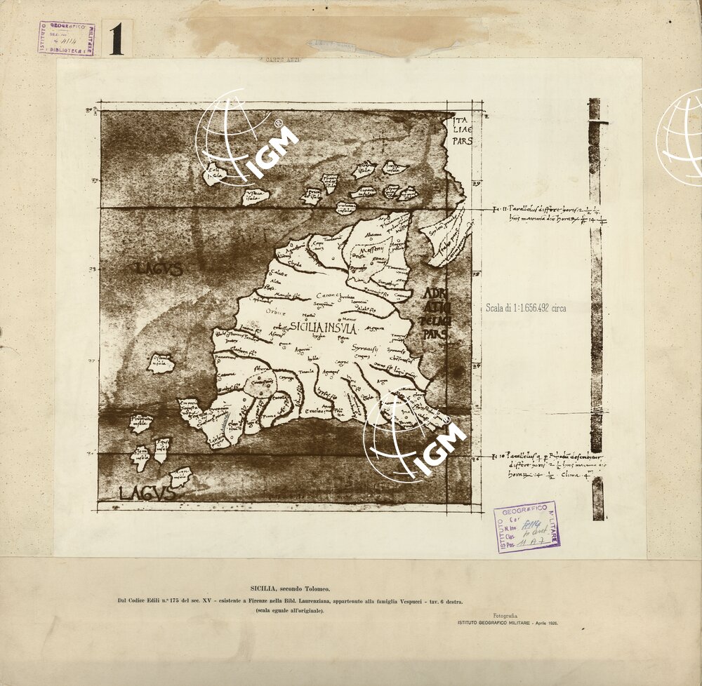 Dal Codice Edili n. 175 del sec. XV esistente a Firenze nella Bibl. Laurenziana, appartenuto alla famiglia Vespucci. Tav. 6 destra. Scala eguale all’originale. Fotografia; I.G.M. (FI).