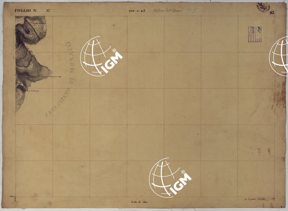 Rilievo regolare in 99 tavolette (minute di campagna) del territorio della Contea di Nizza. Il rilievo è dimostrato a curve orizzontali, tracciate all’equidistanza di 10 metri. Gli operatori furono ufficiali di armi diverse, probabilmente allievi della Scuola di S. M. : Avet, Albert, Borson, Basso, Bergalli, Costanze, Cordon, Ceva, Colli, Carderina, Cordero, Coda, Di Pralormo, Dal Pozzo, De Fornari, De Candia, D’Angennes, Escoffier, Federici, Falicon, Govone, La Grange, La Fleche, Muletti, Marazzano, Mazè, Morozzo, Mariani, Pictet, Ponzani, Piola Caselle, Righini, Rinaudo, Ricci, S. Andrea, Somis, Villamarina.
