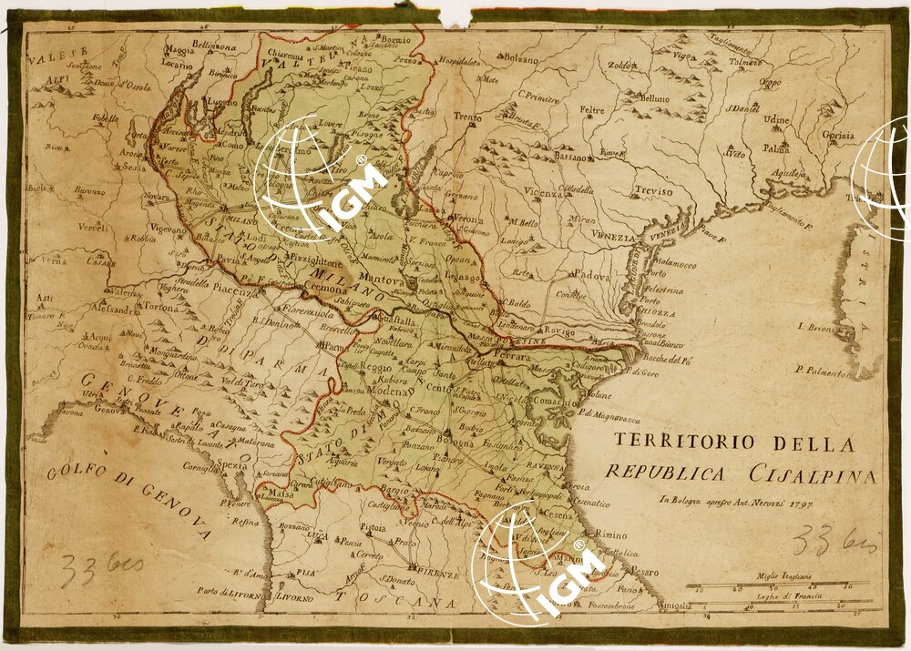 Cartina in foglio unico incisa su rame.Orografia prospettica a monticelli. Sono tracciate poche strade. Toponomastica scarsa.Territorio della Repubblica e confini a colori. Due scale grafiche in miglia italiane e leghe di Francia.