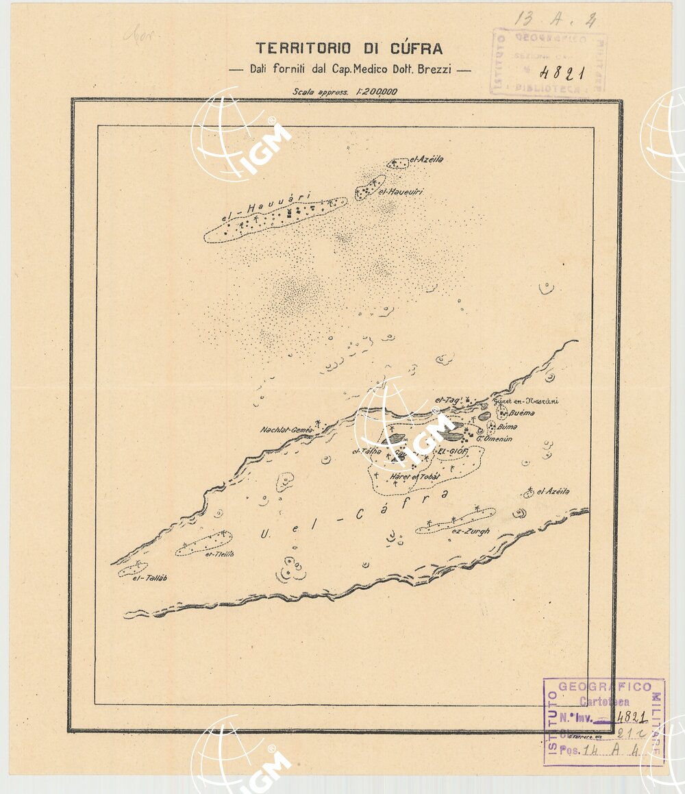Cfr. GOVERNO DELLA CIRENAICA, Bollettino Geografico n. 8; e BREZZI, Cento giorni di prigionia nell’oasi di Cufra. Mondadori 1930.