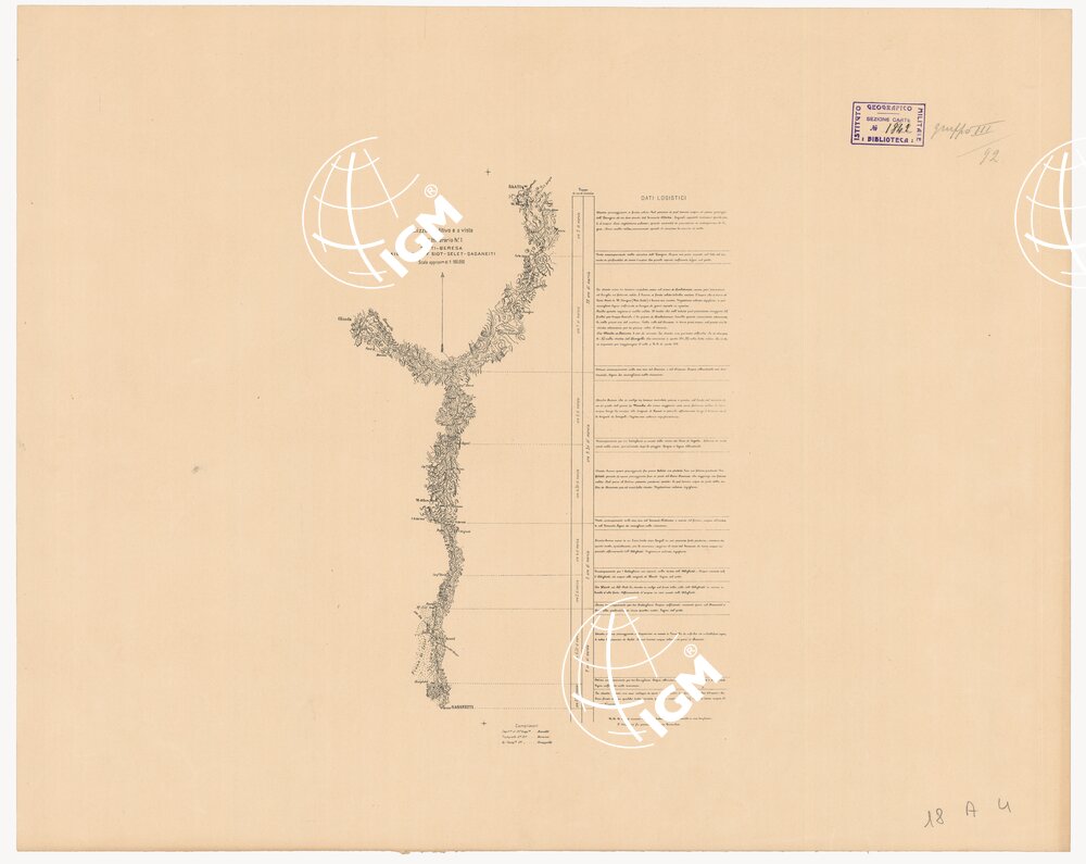 Il disegno delle strade è in rosso; le acque sono colorate in bleu; l’orografia in bistro dimostrata col tratteggio. Ogni itinerario è accompagnato dalla leggenda dei dati logistici. Le distanze sono calcolate in ore di marcia. L’atlante che raccoglie gli itinerari è corredato di uno schizzo logistico della Colonia Eritrea alla scala di 1:250.000 compilato dal Cap. Ravelli e da un quadro d’unione alla scala di 1:500.000 con indici.