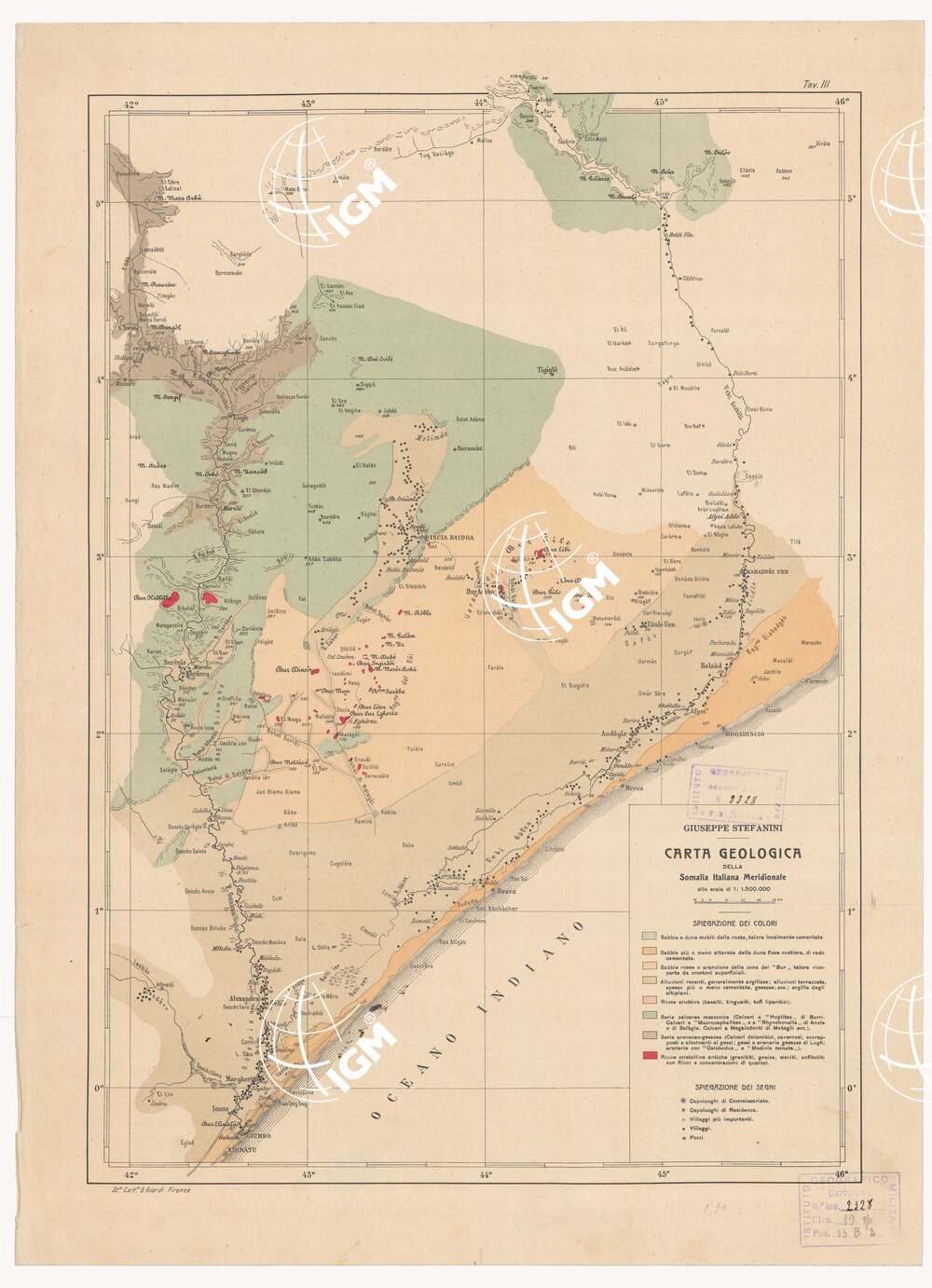 Sono gli itinerari seguiti e rilevati dai due viaggiatori dott. G. Stefanini e dott. G. Paoli ai quali il Governatore della Somalia, Sen. De Martino, affidava, alla fine del 1912, l’incarico di eseguire nella Somalia meridionale gli studi sulle condizioni idrologiche e sul problema minerario, contemporaneamente a studi di botanica e entomologia agraria. La Missione giungeva a Mogadiscio il 5 maggio 1913, diretta poi a Chisimaio e Giumbo da dove raggiungeva per terra, lungo il Giuba, Marghereb. Perveniva quindi, in battello, a Bardera. Venivano compiute escursioni fino a Egherta (2°5′ lat. nord; 43° 13′ long. est); la spedizione raggiungeva in seguito Berdale e Iscia Baidoa. Altre visite venivano effettuate a Bur Acàba, alle colline granitiche di Bur Eibi e Uanle Uen da dove, con percorso del tutto nuovo, veniva raggiunto Mogadiscio. Gli itinerari perciò sono di un interesse particolare in quanto svoltisi in zone delle quali non esistevano rappresentazioni cartografiche attendibili e alcune delle quali non ancora visitate da bianchi. Rilevati alla bussola e disegnati alla scala di 1:100.000 essi furono poi riprodotti a scale minori e corredati della rappresentazione geologica. La tavola I è inoltre corredata di due rilevamenti parziali dei dintorni di Bardera (1:100.000) e di Bur Acàba (1:30.000); la tavola II contiene quattro spaccati (scala delle altezze 1:50.000).