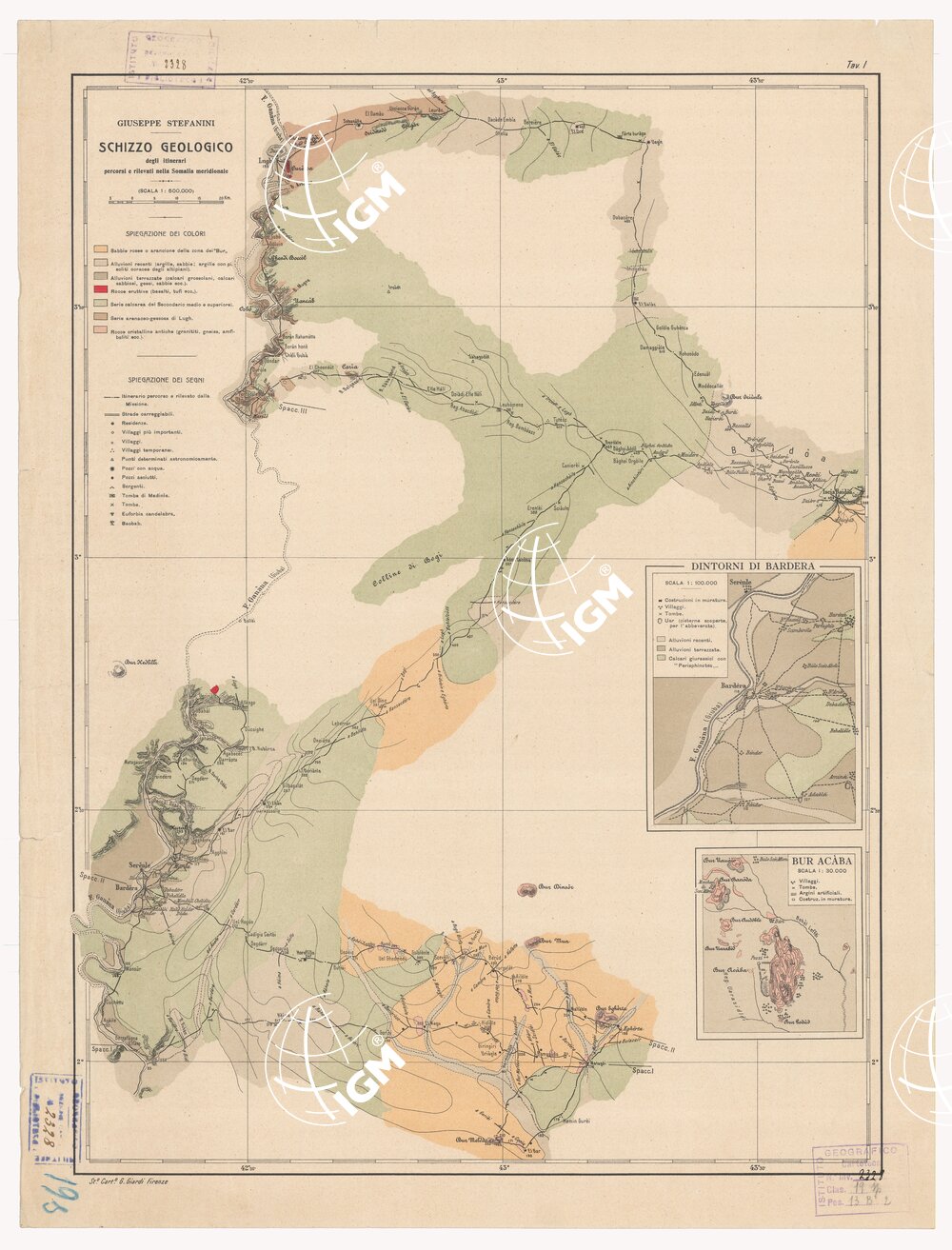 Sono gli itinerari seguiti e rilevati dai due viaggiatori dott. G. Stefanini e dott. G. Paoli ai quali il Governatore della Somalia, Sen. De Martino, affidava, alla fine del 1912, l’incarico di eseguire nella Somalia meridionale gli studi sulle condizioni idrologiche e sul problema minerario, contemporaneamente a studi di botanica e entomologia agraria. La Missione giungeva a Mogadiscio il 5 maggio 1913, diretta poi a Chisimaio e Giumbo da dove raggiungeva per terra, lungo il Giuba, Marghereb. Perveniva quindi, in battello, a Bardera. Venivano compiute escursioni fino a Egherta (2°5′ lat. nord; 43° 13′ long. est); la spedizione raggiungeva in seguito Berdale e Iscia Baidoa. Altre visite venivano effettuate a Bur Acàba, alle colline granitiche di Bur Eibi e Uanle Uen da dove, con percorso del tutto nuovo, veniva raggiunto Mogadiscio. Gli itinerari perciò sono di un interesse particolare in quanto svoltisi in zone delle quali non esistevano rappresentazioni cartografiche attendibili e alcune delle quali non ancora visitate da bianchi. Rilevati alla bussola e disegnati alla scala di 1:100.000 essi furono poi riprodotti a scale minori e corredati della rappresentazione geologica. La tavola I è inoltre corredata di due rilevamenti parziali dei dintorni di Bardera (1:100.000) e di Bur Acàba (1:30.000); la tavola II contiene quattro spaccati (scala delle altezze 1:50.000).
