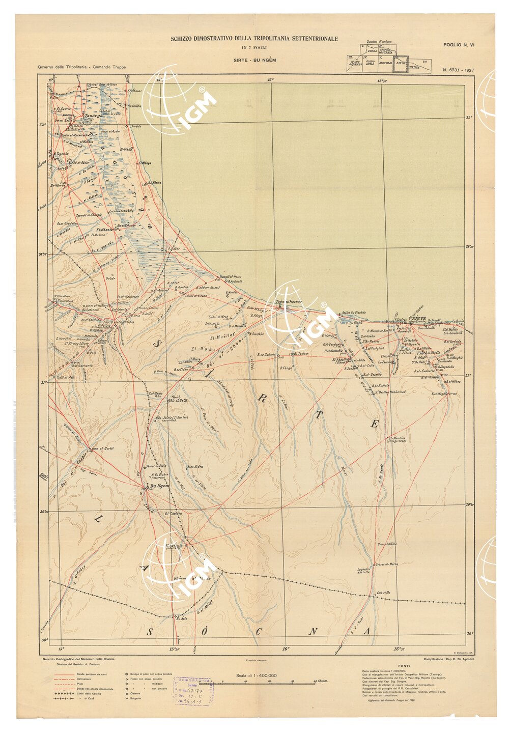 La carta si compone di sette fogli estesi sulla costa alla zona compresa tra i confini della Tunisia e la Sirtica e nell’interno fino al 30° parallelo lat. nord. La carta è stampata a colori con orografia rappresentata dimostrativamente a curve di livello in bistro, idrografia in azzurro, rete stradale in rosso scritture e confini in nero. Particolarmente dimostrate sono le condizioni idrologiche della regione. Ogni foglio porta indicate le fonti sulle quali è basata la compilazione. in generale per la zona costiera veniva usufruito il rilievo regolare dell’I.G.M. e per il rimanente del territorio rilievi a vista e ricognizioni di ufficiali delle truppe indigene, itinerari di pattuglie dei R.R. Carabinieri e dello stesso compilatore (Cap. E. De Agostini). I titoli dei fogli sono: 1) Zuara; 2) Tripoli Misurata; 3) Nalùt Gadames; 4) Giado Mizda; 5) Béniulid; 6) Sirte; 7) Sirtica. Della carta esiste un’edizione più antica datata al 1915-1916 (v. N. 2220 d’ inventario gen.) con annessa una carta della regione sirtica al 400.000 e l’elenco dei nomi di località.