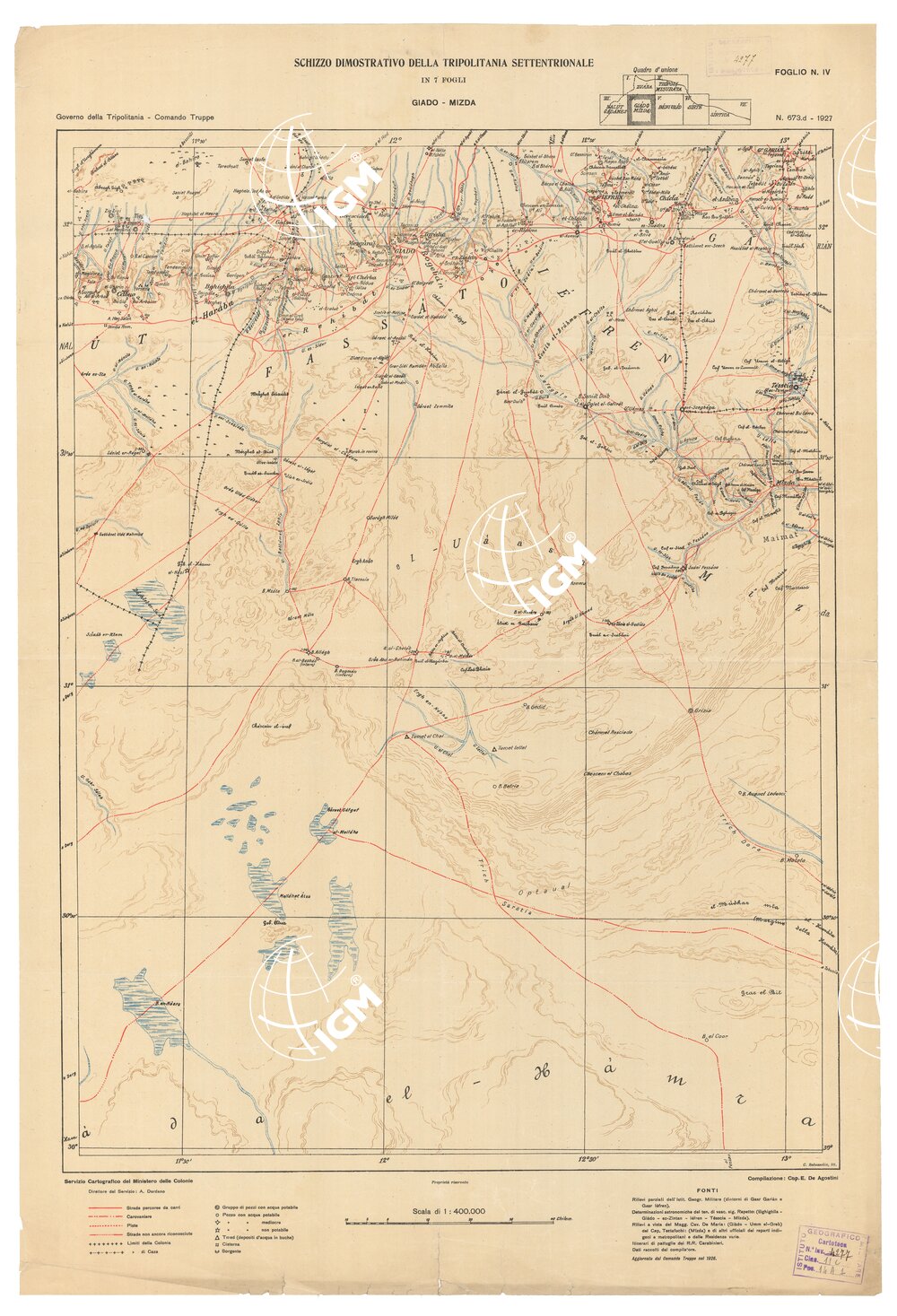 La carta si compone di sette fogli estesi sulla costa alla zona compresa tra i confini della Tunisia e la Sirtica e nell’interno fino al 30° parallelo lat. nord. La carta è stampata a colori con orografia rappresentata dimostrativamente a curve di livello in bistro, idrografia in azzurro, rete stradale in rosso scritture e confini in nero. Particolarmente dimostrate sono le condizioni idrologiche della regione. Ogni foglio porta indicate le fonti sulle quali è basata la compilazione. in generale per la zona costiera veniva usufruito il rilievo regolare dell’I.G.M. e per il rimanente del territorio rilievi a vista e ricognizioni di ufficiali delle truppe indigene, itinerari di pattuglie dei R.R. Carabinieri e dello stesso compilatore (Cap. E. De Agostini). I titoli dei fogli sono: 1) Zuara; 2) Tripoli Misurata; 3) Nalùt Gadames; 4) Giado Mizda; 5) Béniulid; 6) Sirte; 7) Sirtica. Della carta esiste un’edizione più antica datata al 1915-1916 (v. N. 2220 d’ inventario gen.) con annessa una carta della regione sirtica al 400.000 e l’elenco dei nomi di località.