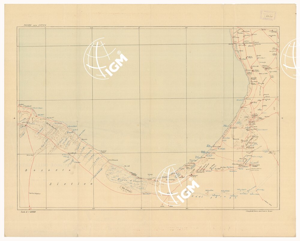 La carta si compone di sette fogli estesi sulla costa alla zona compresa tra i confini della Tunisia e la Sirtica e nell’interno fino al 30° parallelo lat. nord. La carta è stampata a colori con orografia rappresentata dimostrativamente a curve di livello in bistro, idrografia in azzurro, rete stradale in rosso scritture e confini in nero. Particolarmente dimostrate sono le condizioni idrologiche della regione. Ogni foglio porta indicate le fonti sulle quali è basata la compilazione. in generale per la zona costiera veniva usufruito il rilievo regolare dell’I.G.M. e per il rimanente del territorio rilievi a vista e ricognizioni di ufficiali delle truppe indigene, itinerari di pattuglie dei R.R. Carabinieri e dello stesso compilatore (Cap. E. De Agostini). I titoli dei fogli sono: 1)Zuara; 2) Tripoli Misurata; 3) Nalùt Gadames; 4) Giado Mizda; 5) Béniulid; 6) Sirte; 7) Sirtica. Della carta esiste un’edizione più antica datata al 1915-1916 (v. N. 2220 d’ inventario gen.) con annessa una carta della regione sirtica al 400.000 e l’elenco dei nomi di località.