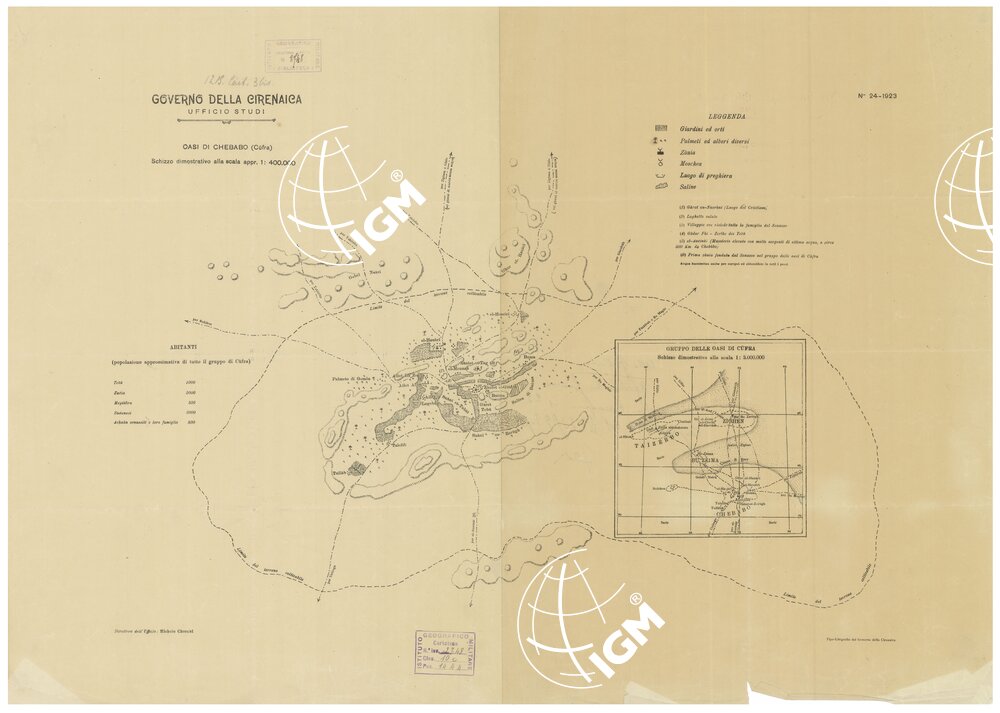Schizzo dimostrativo con inserito una bozza del gruppo delle oasi di Cufra alla scala di 1:3.000.000 ed i dati approssimativi sulla popolazione di tutto il gruppo di Cufra.