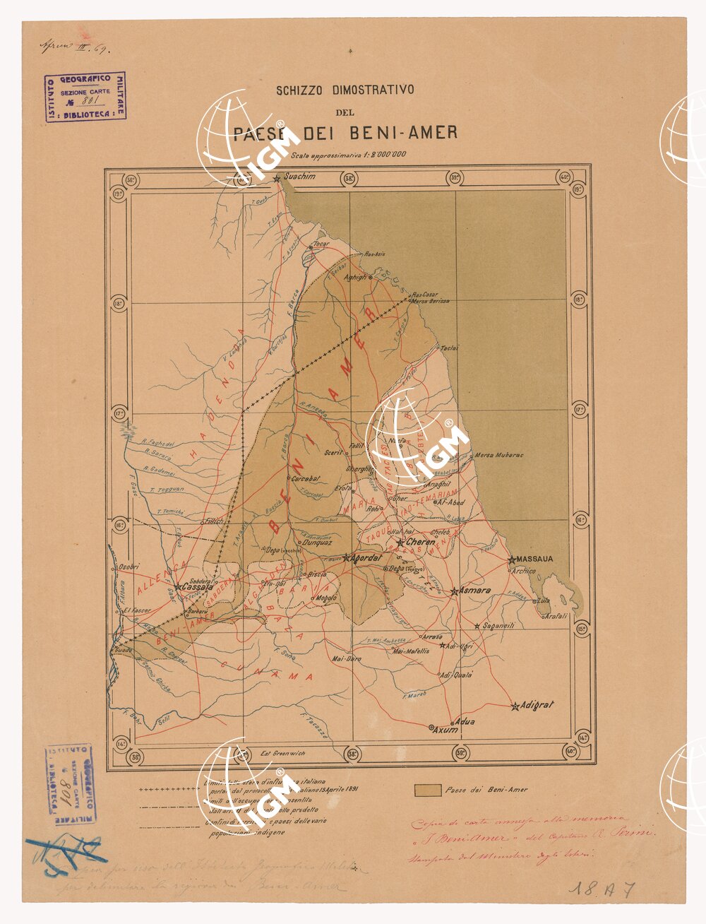 Copia di carta annessa alla memoria “I Beni Amer”, del Cap. R. Perini (1905), stampata dal Ministero degli Esteri. Stampa a colori con i limiti della sfera di influenza italiana portati dal protocollo anglo-italiano del 15 aprile 1891, i limiti dell’occupazione consentita all’articolo 11 del protocollo predetto e i confini dei territori e paesi delle varie popolazioni indigene. É rappresentata la sola planimetria. Le longitudini derivano dal meridiano di Greenwich.