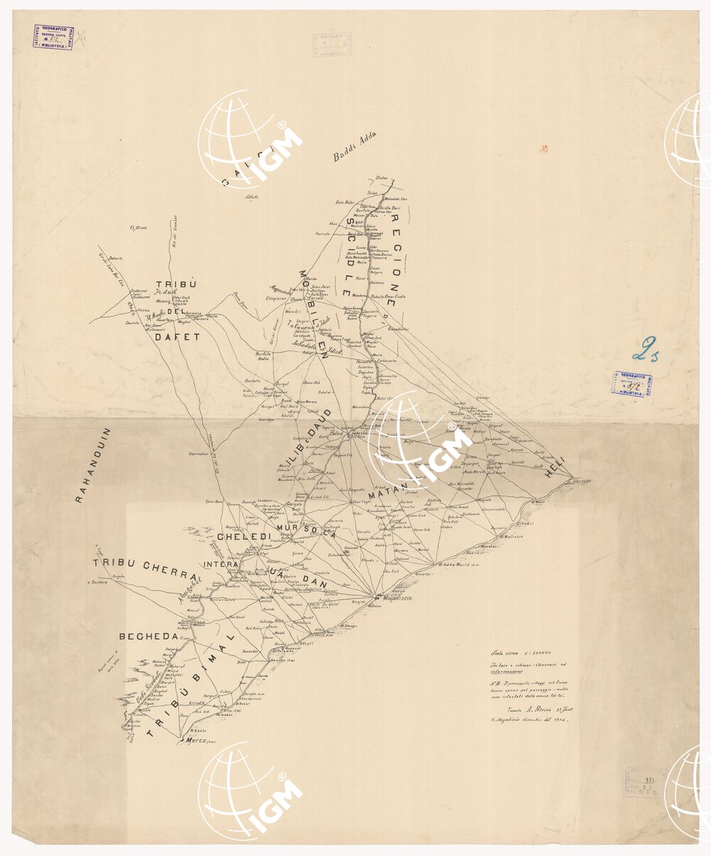 Una planimetria fondata su schizzi, itinerari e informazioni, compilata dal Ten. A. Petrini. Stampa in nero, in foglio unico. Reca indicati i nomi delle tribù.