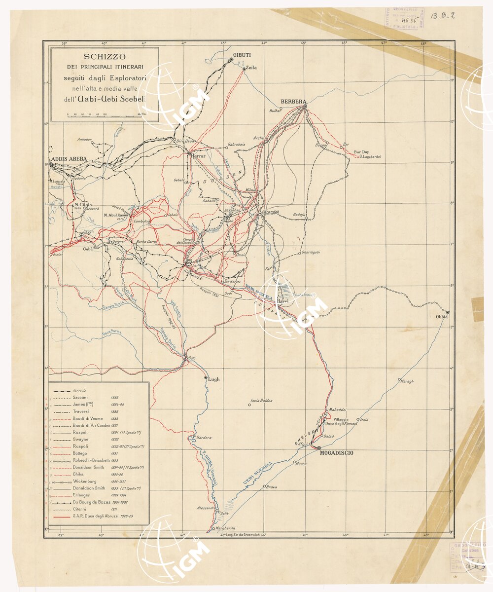 Cartina a colori annessa al volume “La esplorazione dell’ Uabi-Uebi Scebeli Dalle sue sorgenti nella Etiopia Meridionale alla Somalia Italiana”, 1928-1929, di S. A. R. Luigi Amedeo di Savoia Aosta Duca degli Abruzzi. (A. Mondadori, 1932).