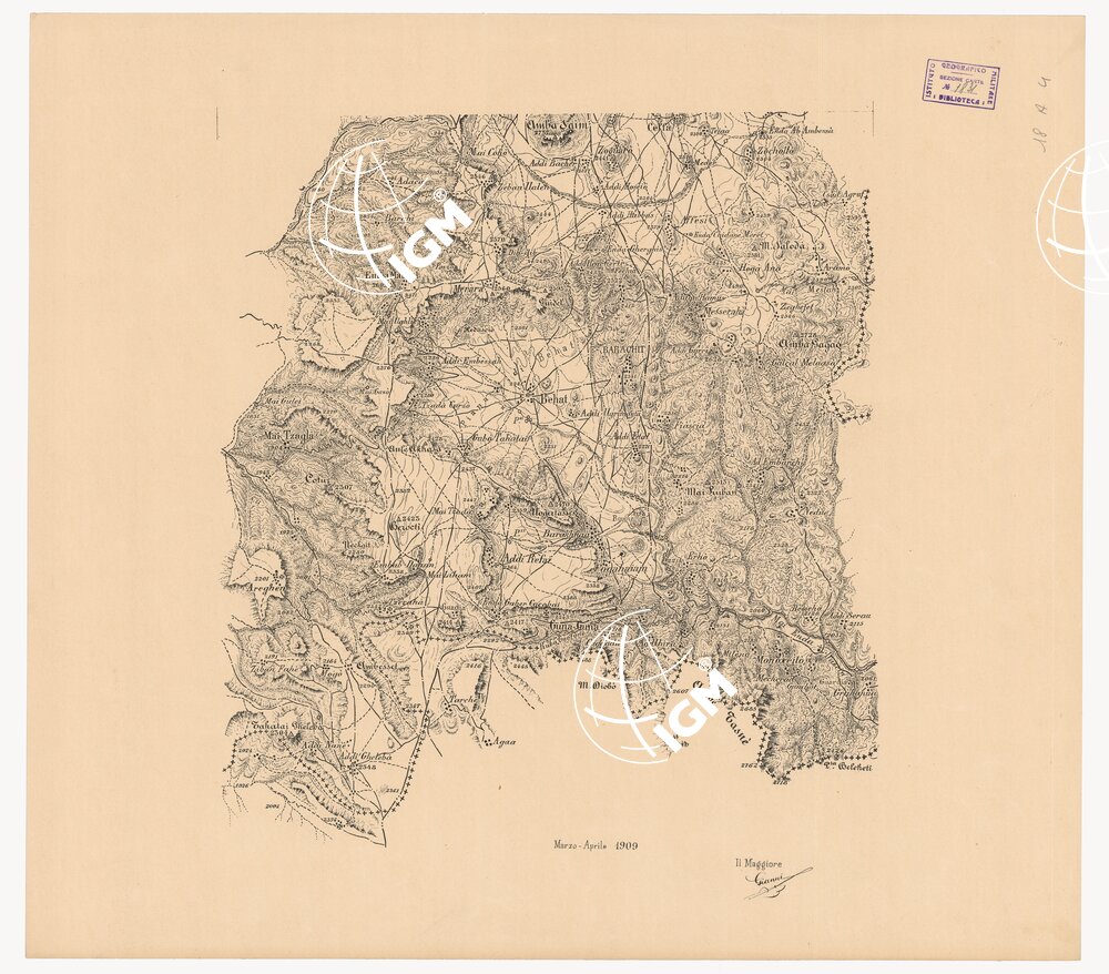 Ingrandimento dei rilievi topografici al 100.000 e ricognizione a vista del terreno. Rilievo orografico rappresentato dimostrativamente a curve e tratteggio. Due togli in fotozincografia in nero.