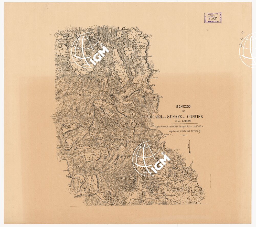 Ingrandimento dei rilievi topografici al 100.000 e ricognizione a vista del terreno. Rilievo orografico rappresentato dimostrativamente a curve e tratteggio. Due togli in fotozincografia in nero.