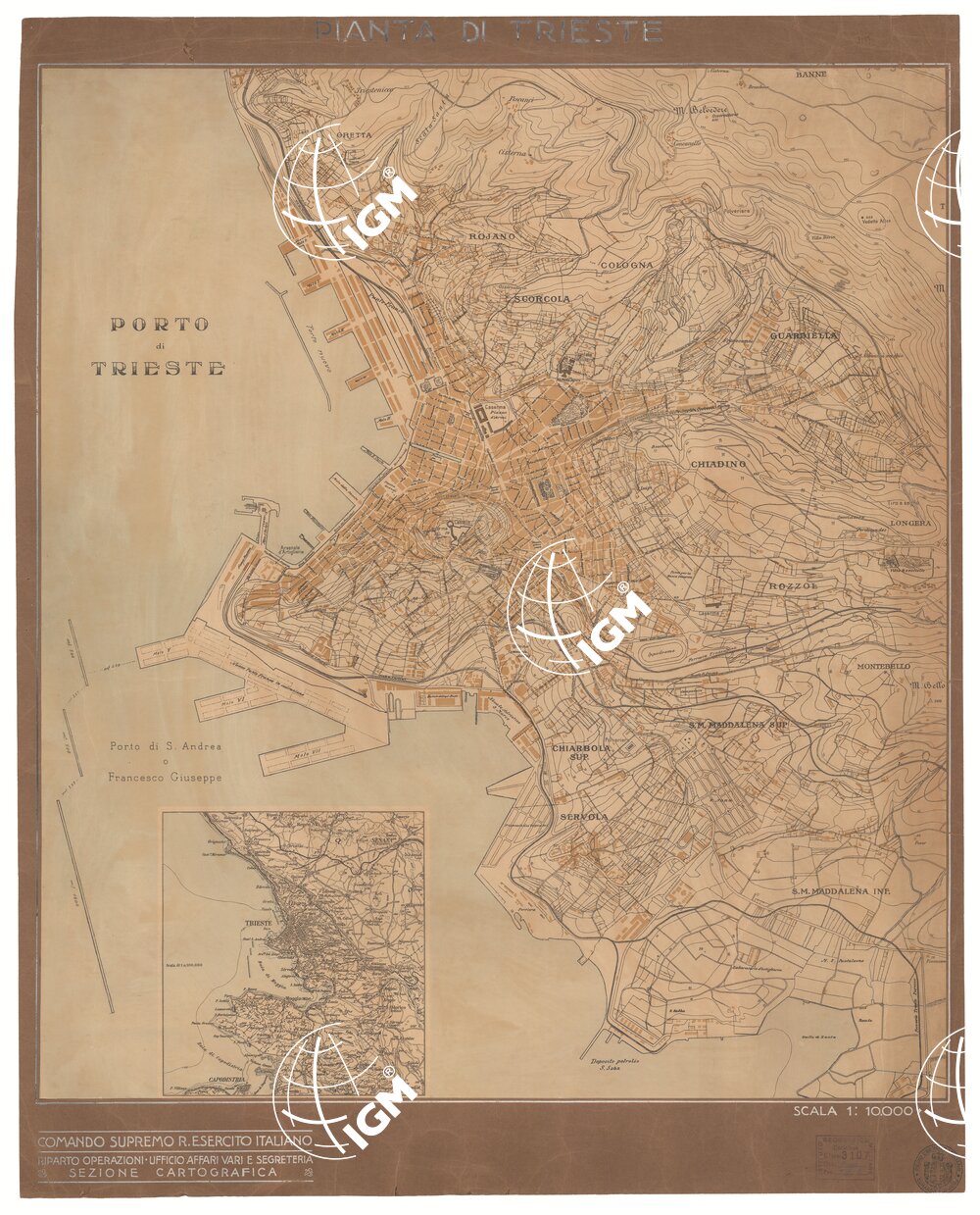 Rappresentazione orografica a curve di livello. In basso a sinistra un riquadro nel quale è rappresentato Trieste e dintorni. Comando Supremo R. Esercito Italiano, Riparto Operazioni Ufficio Affari Vari e Segreteria, Sezione Cartografica.