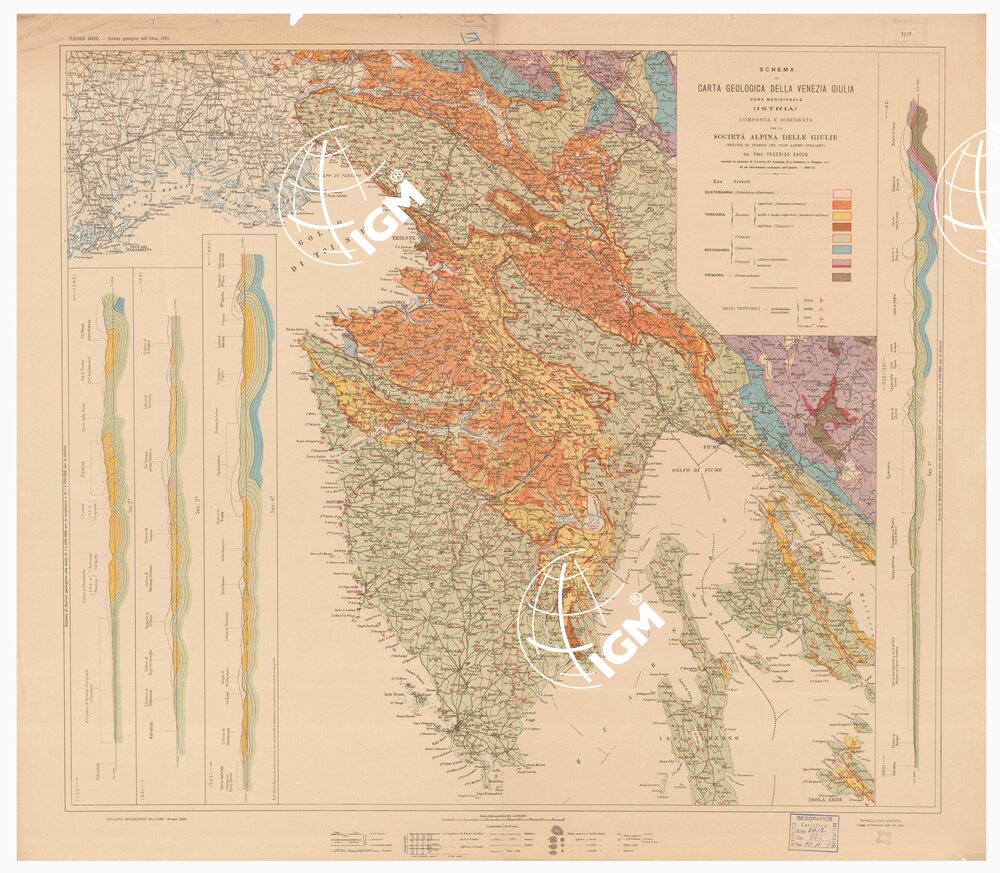 Carta composta e disegnata per la Società Alpina delle Giulie (sezione di Trieste del Club Alpino Italiano) dal prof. Federico Sacco, secondo le ricerche di G. Stache, Fr. Kossmat, R. I. Schubert, L. Waagen, ecc. ed un rilevamento sommario dell’autore. Rappresentazione orografica a curve di livello, l’equidistanza è di 100 metri. Sotto al titolo è presente la spiegazione dei colori, ed in basso quella delle strade e dei centri abitati. Nella carte vi è anche lo schema delle sezioni geologiche alla scala di 1:200.000 per le lunghezze e di 1:100.000 per le altezze. I.G.M. (FI).