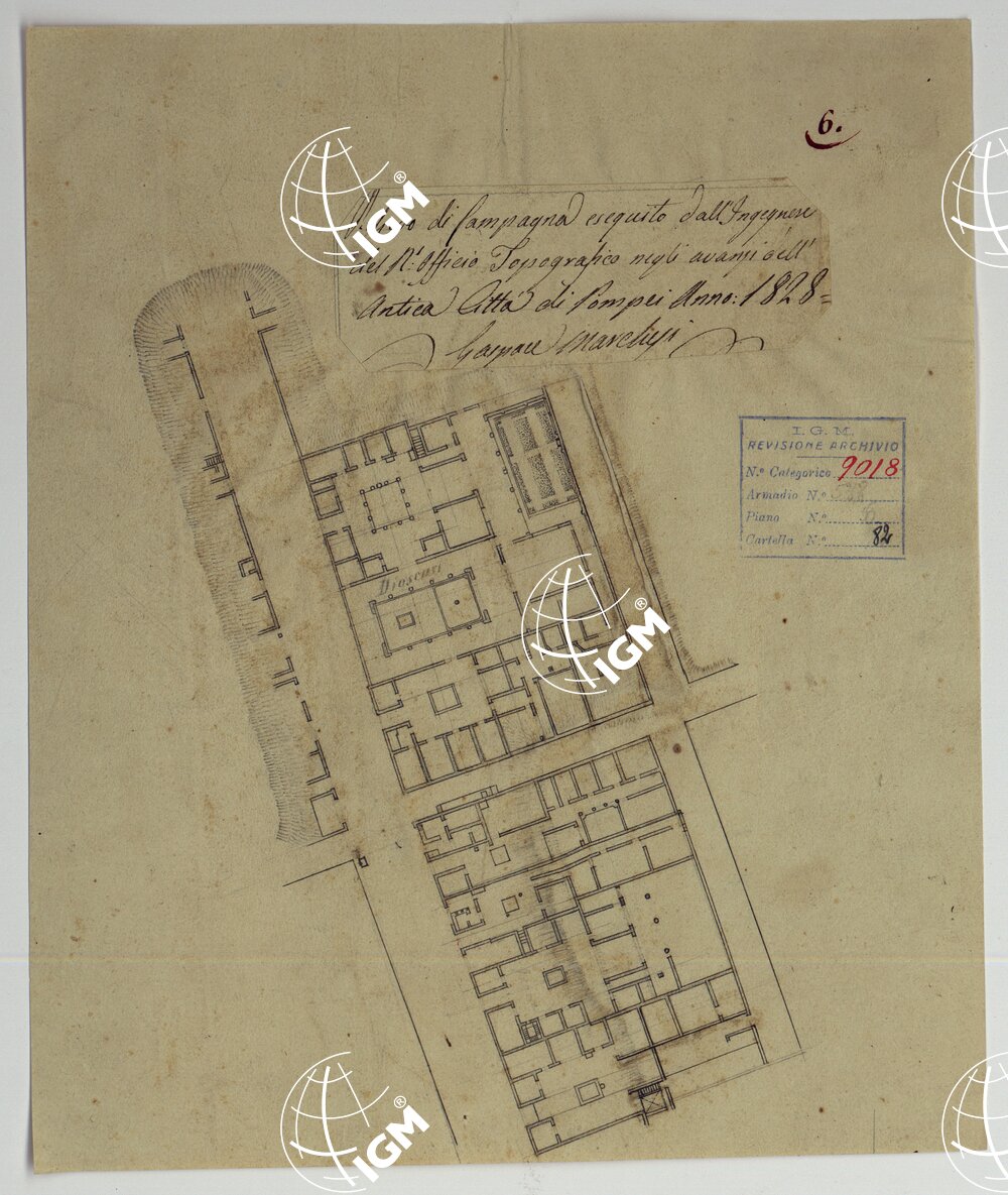Docum. 63. Trentatrè minute a scale varie e di dimensioni diverse, dei rilievi eseguiti dal 1826 al 1840 dall’Ing. Marchesi parte dei quali servirono per la costruzione della “Pianta degli scavi di Pompei” (Docum. 61 – n. di categorico 9016).