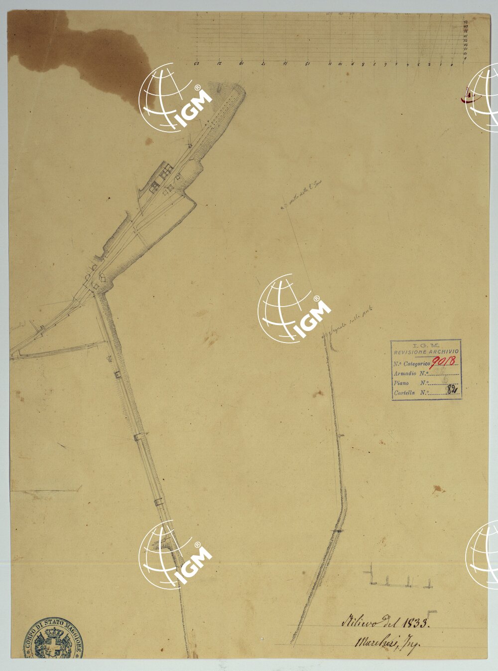 Docum. 63. Trentatrè minute a scale varie e di dimensioni diverse, dei rilievi eseguiti dal 1826 al 1840 dall’Ing. Marchesi parte dei quali servirono per la costruzione della “Pianta degli scavi di Pompei” (Docum. 61 – n. di categorico 9016).