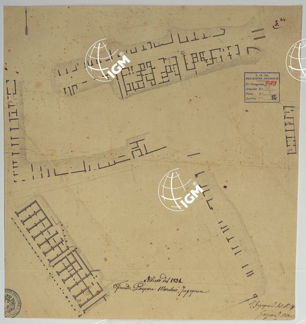Docum. 63. Trentatrè minute a scale varie e di dimensioni diverse, dei rilievi eseguiti dal 1826 al 1840 dall’Ing. Marchesi parte dei quali servirono per la costruzione della “Pianta degli scavi di Pompei” (Docum. 61 – n. di categorico 9016).