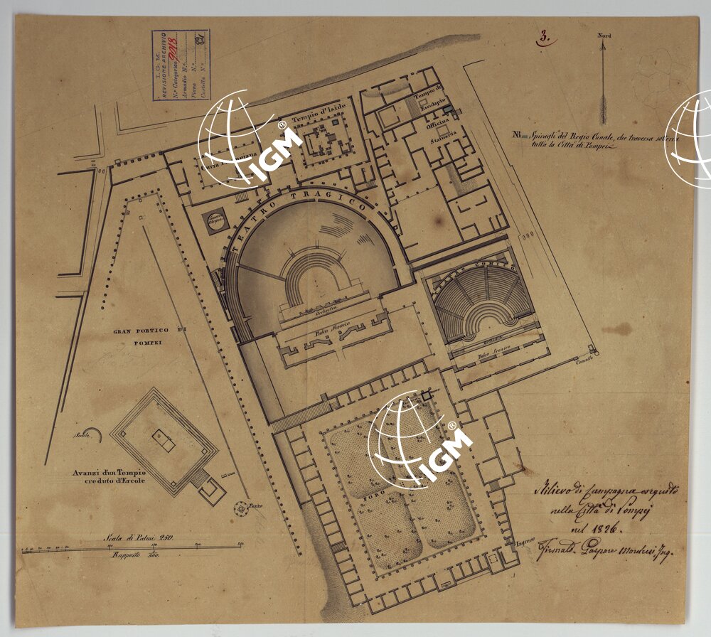 Docum. 63. Trentatrè minute a scale varie e di dimensioni diverse, dei rilievi eseguiti dal 1826 al 1840 dall’Ing. Marchesi parte dei quali servirono per la costruzione della “Pianta degli scavi di Pompei” (Docum. 61 – n. di categorico 9016).