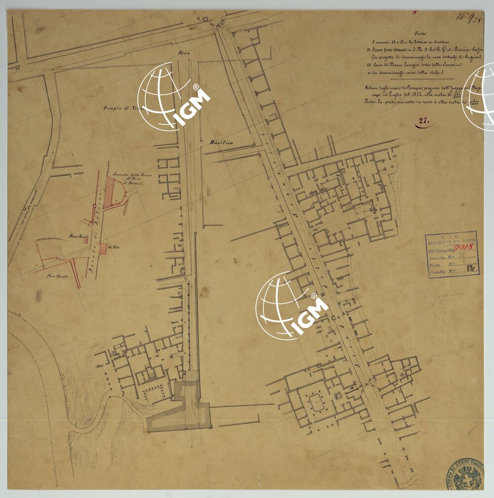 Docum. 63. Trentatrè minute a scale varie e di dimensioni diverse, dei rilievi eseguiti dal 1826 al 1840 dall’Ing. Marchesi parte dei quali servirono per la costruzione della “Pianta degli scavi di Pompei” (Docum. 61 – n. di categorico 9016).