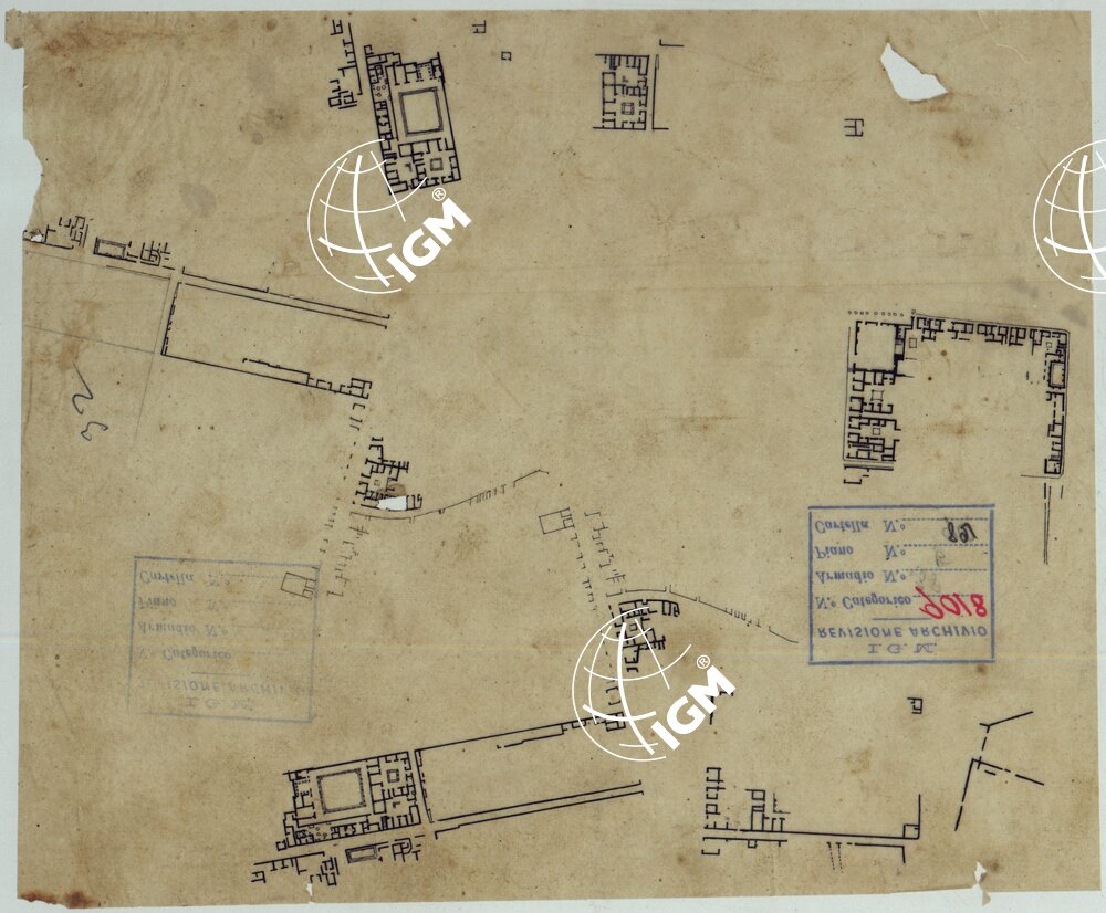 Docum. 63. Trentatrè minute a scale varie e di dimensioni diverse, dei rilievi eseguiti dal 1826 al 1840 dall’Ing. Marchesi parte dei quali servirono per la costruzione della “Pianta degli scavi di Pompei” (Docum. 61 – n. di categorico 9016).