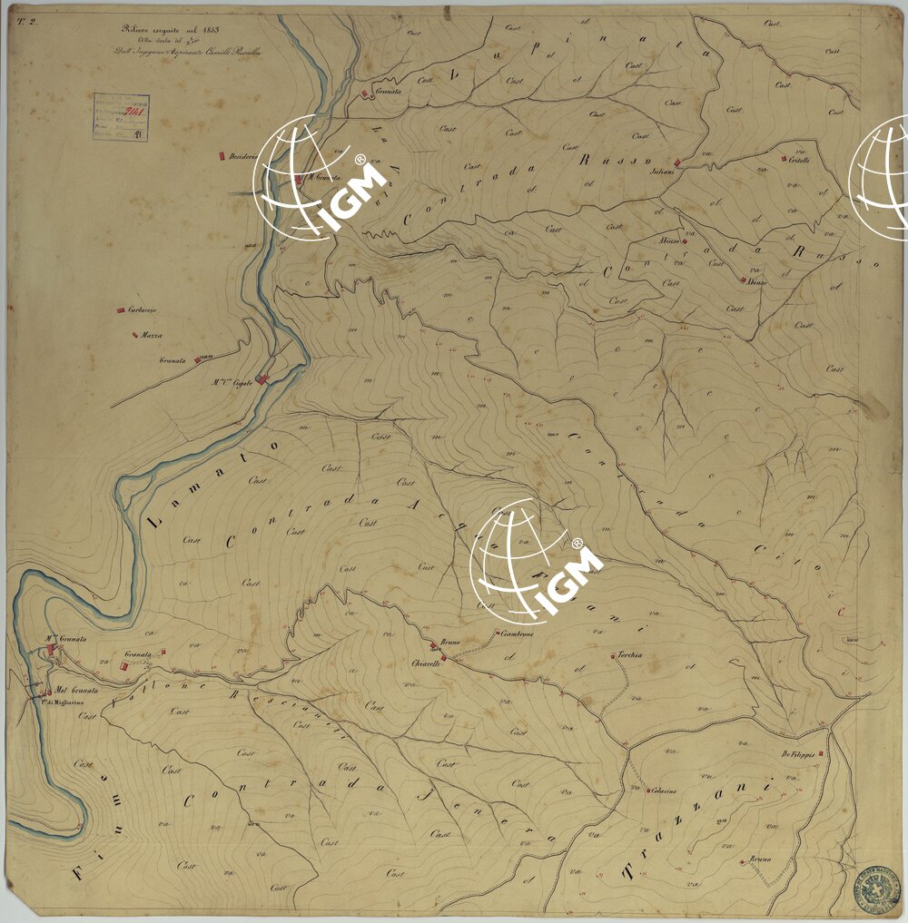 Documento N. 19. Nove minute dei rilievi originali eseguiti dagli ufficiali ed ingegneri dell’Officio Topografico di Napoli. Rappresentano l’orografia mediante curve di livello tracciate all’equidistanza di m. 35 (m. 9,10): gli abitati sono in rosso; le acque in azzurro. Ciascuna minuta reca la firma dell’operatore e la data. Annessa una “Pianta Topografica di Tiriolo e del terreno adiacente alla scala dell’1:10.000” su carta lucida, desunta dal rilievo speciale alla scala del 2.000.