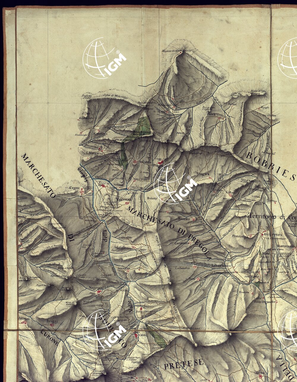 Due grandi fogli disegnati a penna ed acquerellati. La carta è ricca di particolari topografici e toponomastici. Non porta indicazione nè di data nè di autore, ma si può ritenere della fine del secolo XVIII. Una nota nel retro della carta reca “Cette carte a ètè particulierment levèe pour resoudre des contestations sur les limits de ce pays. La tipografie est assez bien exprimèe”.