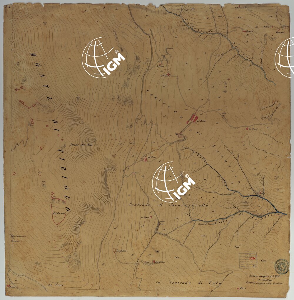 Documento N. 19. Nove minute dei rilievi originali eseguiti dagli ufficiali ed ingegneri dell’Officio Topografico di Napoli. Rappresentano l’orografia mediante curve di livello tracciate all’equidistanza di m. 35 (m. 9,10): gli abitati sono in rosso; le acque in azzurro. Ciascuna minuta reca la firma dell’operatore e la data. Dimensioni m. 0,68×0,68. Annessa una “Pianta Topografica di Tiriolo e del terreno adiacente alla scala dell’1:10.000” su carta lucida, desunta dal rilievo speciale alla scala del 2.000, delle dimensioni di m. 0,42×0,55.